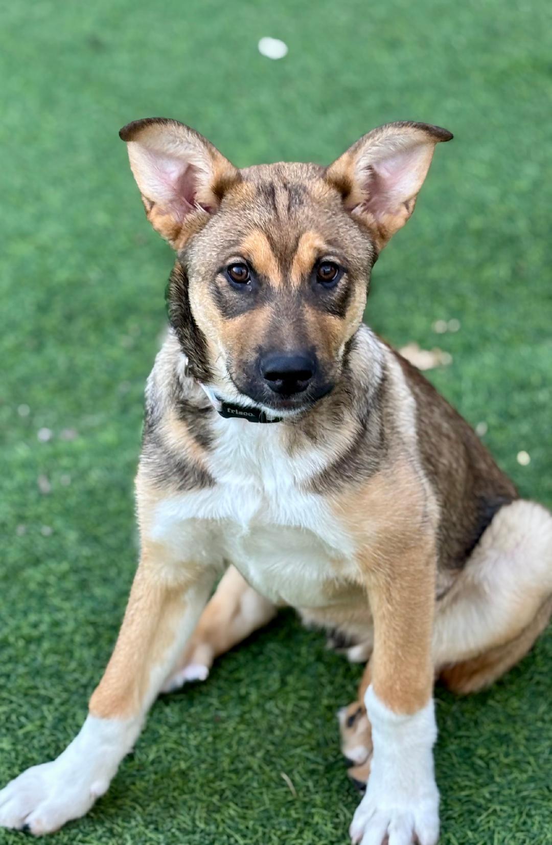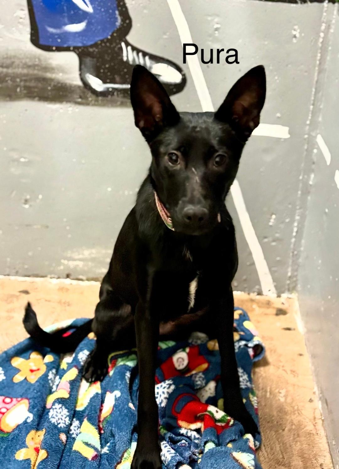 Pura is a 1 year old small breed mix. She is about 20 lbs. Her and her brother were rescued from a high kill shelter in California. She is good with most dogs, big and small. We are working with her daily on potty and kennel training. She is a medium energy dog and needs daily exercise. She knows basic commands. She loves everyone. Pura is currently at our facility and would love to have a foster or adopter take her home.